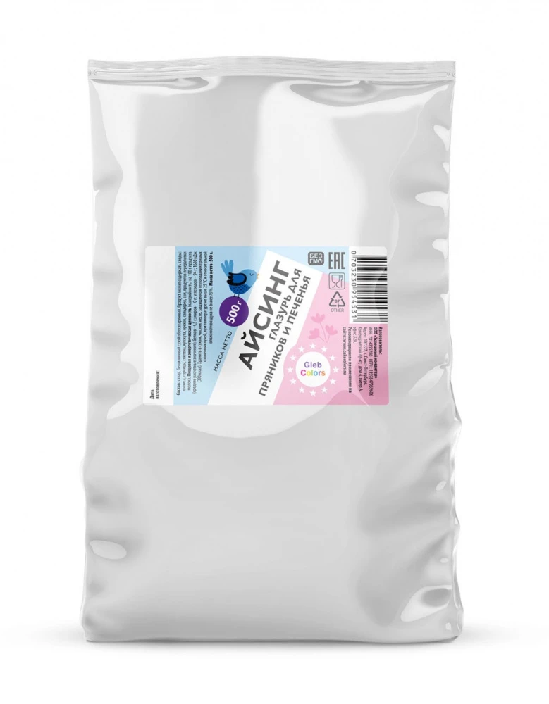 Смесь для приготовления сахарной глазури, с помощью которой можно создать декор для пряников и печенья . Смесь белого (бело-молочного) цвета, при смешивании с водой приобретает более прозрачную консистенцию, при взбивании смесь приобретает белый цвет. Срок годности 9 мес. с даты производства. Хранить сухую смесь при температуре не выше + 25 С относительной влажности не более 75%. Вскрытую пачку необходимо плотно закрывать, для предотвращения попадания кислорода.